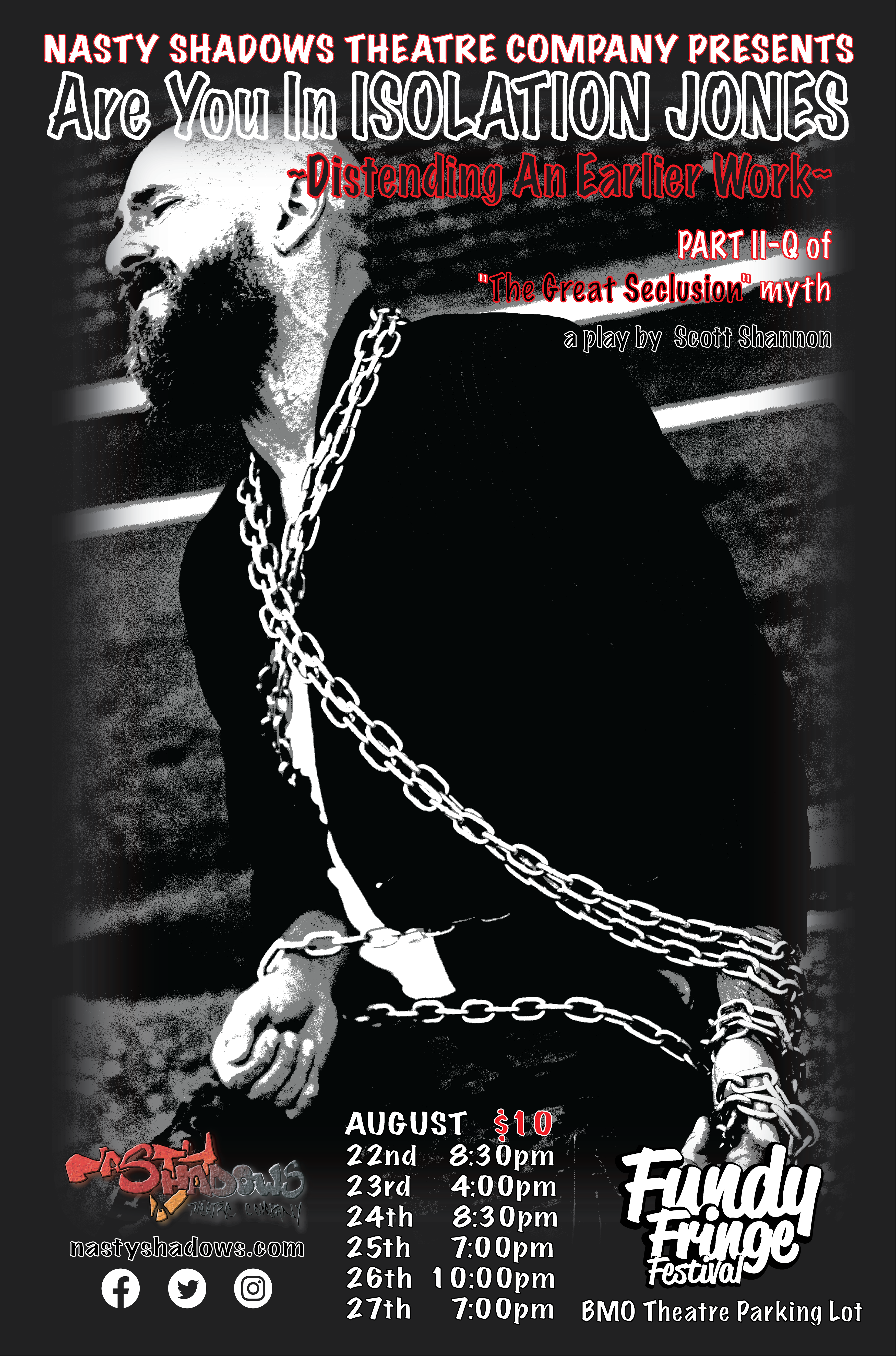 Due to our states of isolation at the time, I thought this seemed like a good opportunity to create and stage my own one-man play – I’d performed a number by MacIvor and others, it seemed time to try this myself now that I’m attempting to breathe more original work into Nasty Shadows’ life (I do have a larger one-man piece I’ve had for a while that I’ve been hesitant to stage but it didn’t fit this event – however, that character would appear in a later version of this new one-man piece … and I’ve since created another longer one-man show that I staged in 2021). Looking at a length of 15min max so we could stage all the pieces in the evening at a good start time before the sun got low. What could I create as a short one-man play? What story was worth telling? Well … it became apparent that the piece I would create would exist in my world of “The Great Seclusion” as this is where all my original work now seems to live and since our real world had become one of seclusion, this all seemed to jive weirdly well … and then I knew the story I could tell: What happened to ‘JONES’ when he fled at the end of A STORY JONES – this was a play we’d created over a number of years, with various Shadows participating along the way, culminating in an intimate staging of the play in the spring of 2019 in our 3 NB cities we try to visit (for now). The play is inspired by a Shadow who passed in 2014, Andrew Jones, a guy who LOVED to tell stories, so the character of JONES is a Storyteller, trapped in the “job” but escapes at the end … so … then what? This is where ISOLATION JONES picks up.
