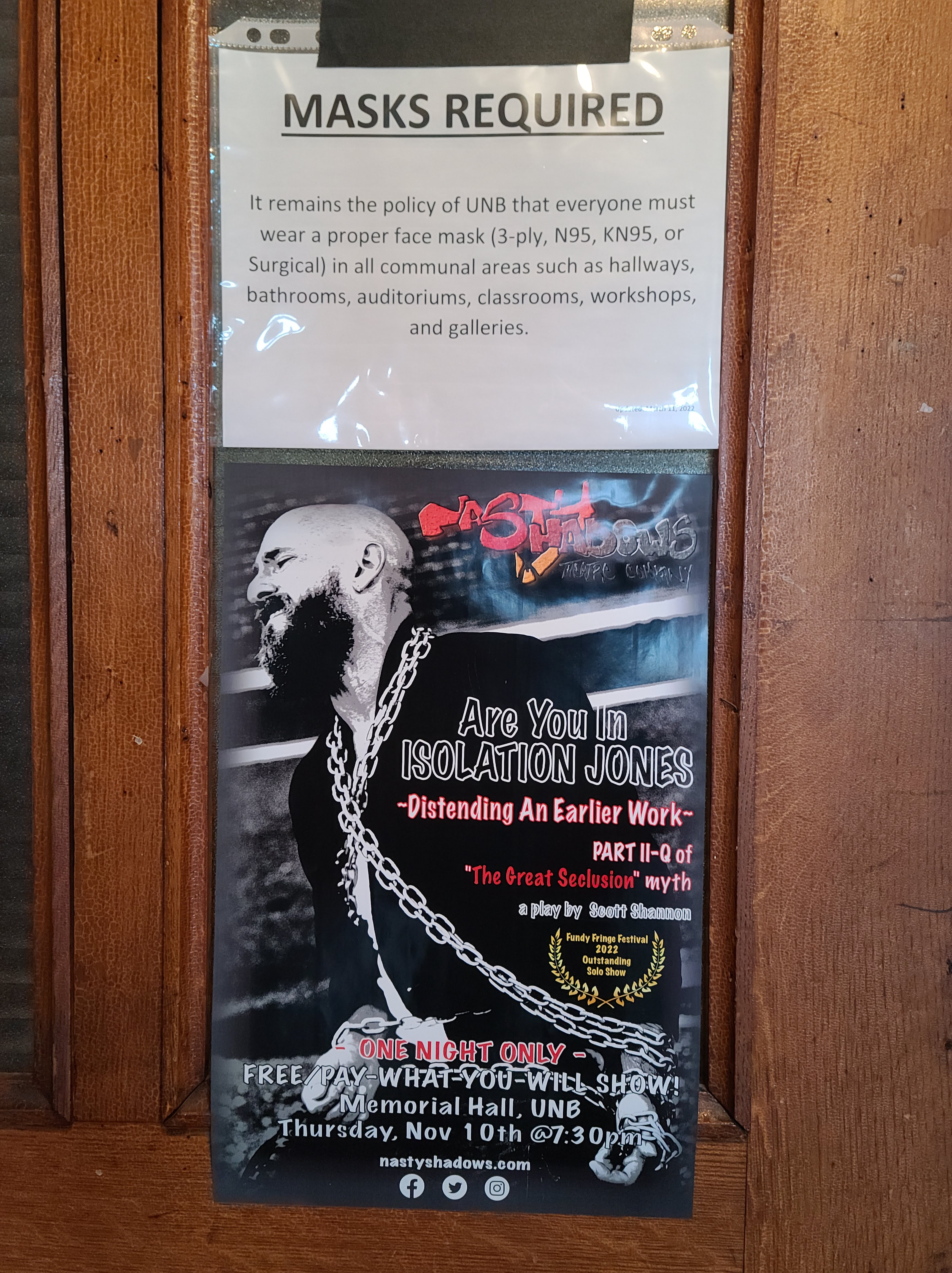 … I stage a “ONE NIGHT ONLY” performance of Are You In ISOLATION JONES at Memorial Hall in Fredericton on the UNB campus, an evening unfolding at the opposite end of the scale from the well managed and group supported event that was Uncle Vanya the previous week … I’ve embraced more of a “Garage Theatre” vibe in the Shadow world and, as mentioned, of late that has meant solo work, but I’ve been supported by other entities with the staging to cover tickets, tech, etc. This time, while I was graciously provided a space to perform, it was all me beyond that and it was quite a thrill and helped me push this solo-show into a new direction by embracing an all-encompassing staging: I did publicity (as usual, such that it is), handled the door, ran the tech while performing, and performed the show that I created. It was quite a trip! Humbling and I don’t recommend it for everyone nor for all of my own theatrics by any means, but handling all these elements to make this show *happen* was very invigorating and I really like what it’s added to the show – so much so that I’ve already planned additional stagings to explore this new angle a bit more and embrace it … I have further ideas for the pre-show time when I need to check on folks in the lobby, perhaps peek at my pay-what-you-will hat, start the show, etc.