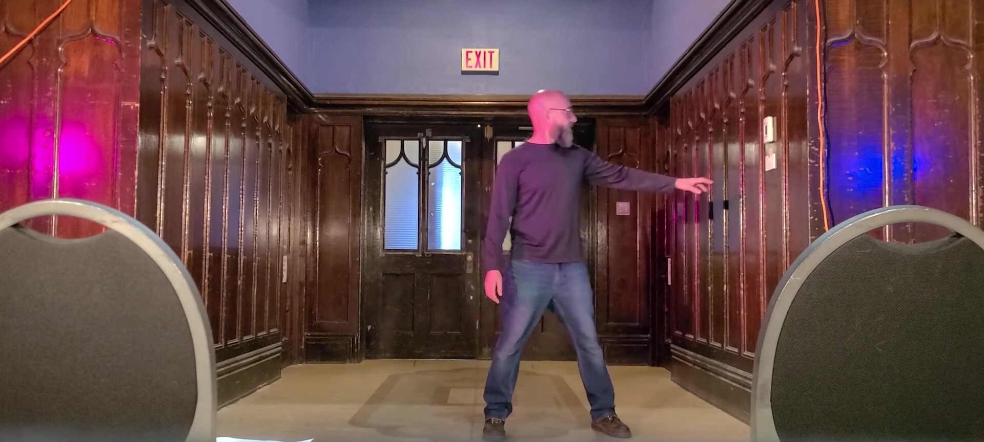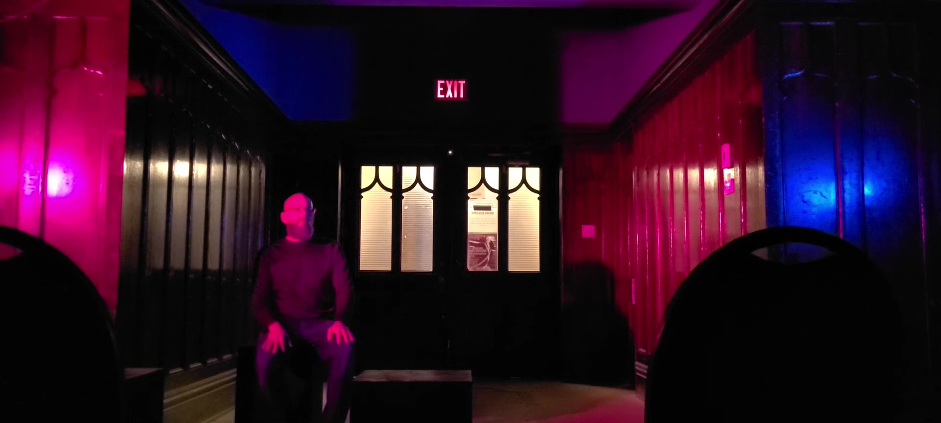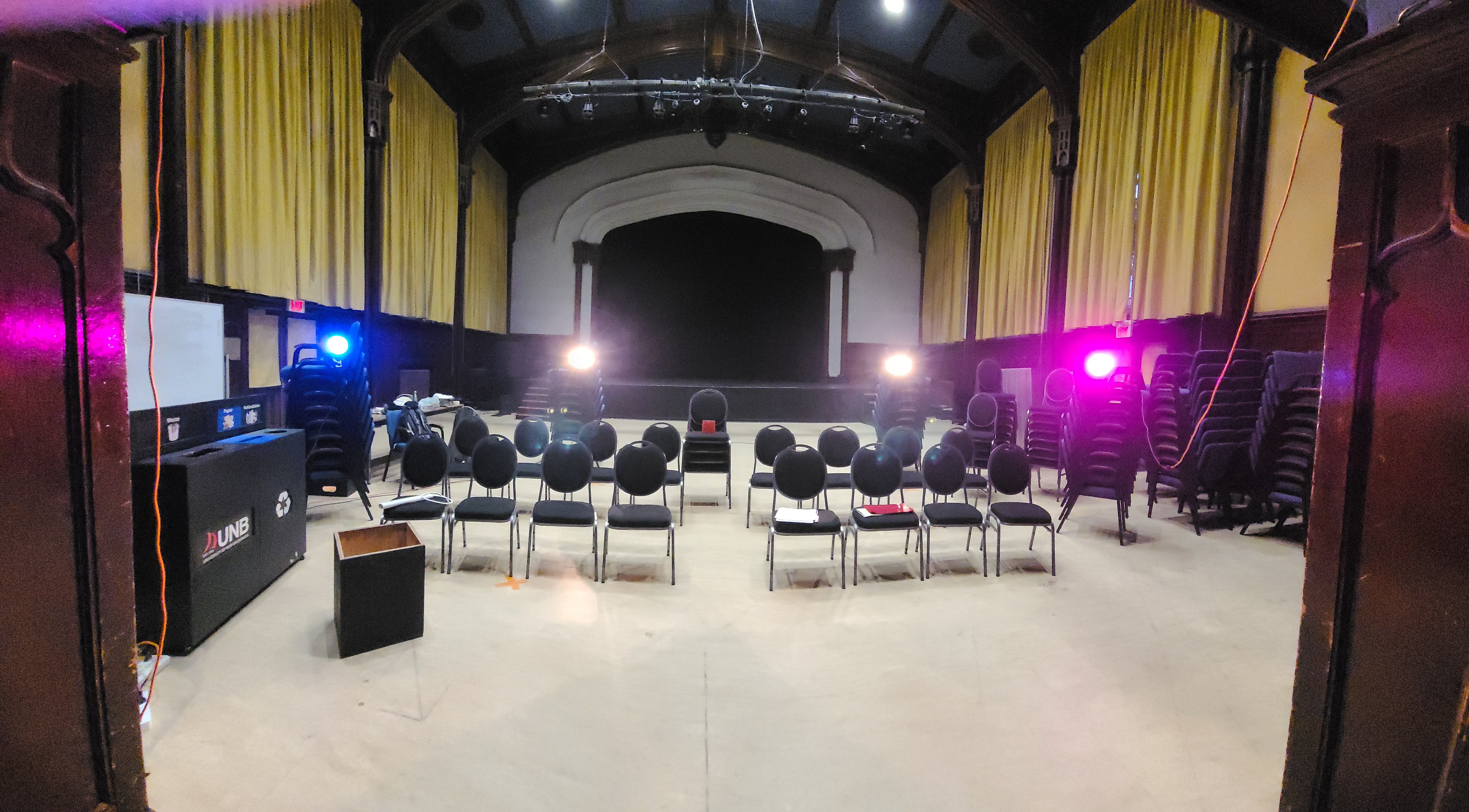 ‘X’, my role in the show, is hosting a “pretend” stealth session so it makes sense I manage all these other production aspects as well … and ties in nicely to another (yet to be performed) play of mine where ‘X’ begins the show in the lobby and unlocks the door to let the audience in. But in this current show this sort of pre-show interplay was not something I had planned because I had built the show for staging at the Fundy Fringe Festival which provided all of the support needed to invite, ticket, seat an audience, have technicians for light and sound support, etc. And so in Memorial Hall I had to figure out a way to use my own lights, run them myself while performing, and also handle the pre-show audience business.
