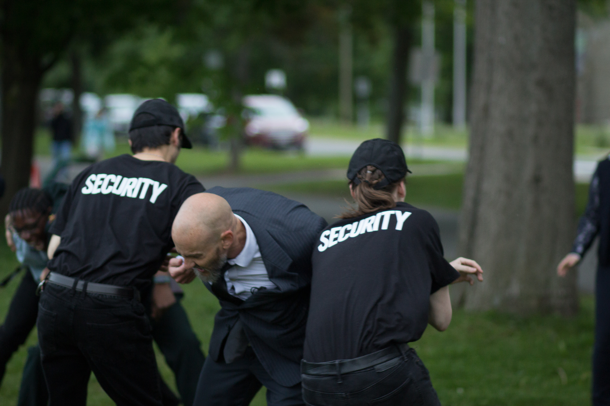 Seeing the snarky looks Alex M. would give me in our various scenes, either on the grass or down in the lower outdoor gallery space – and Naomi putting me in my place in either location! Although my role was to resist this attempt at control – there was a move in a speech I had at the gallery where I would shake as the text roused my up and I would extend an arm/hand to the mob in condemnation … just loved that moment.