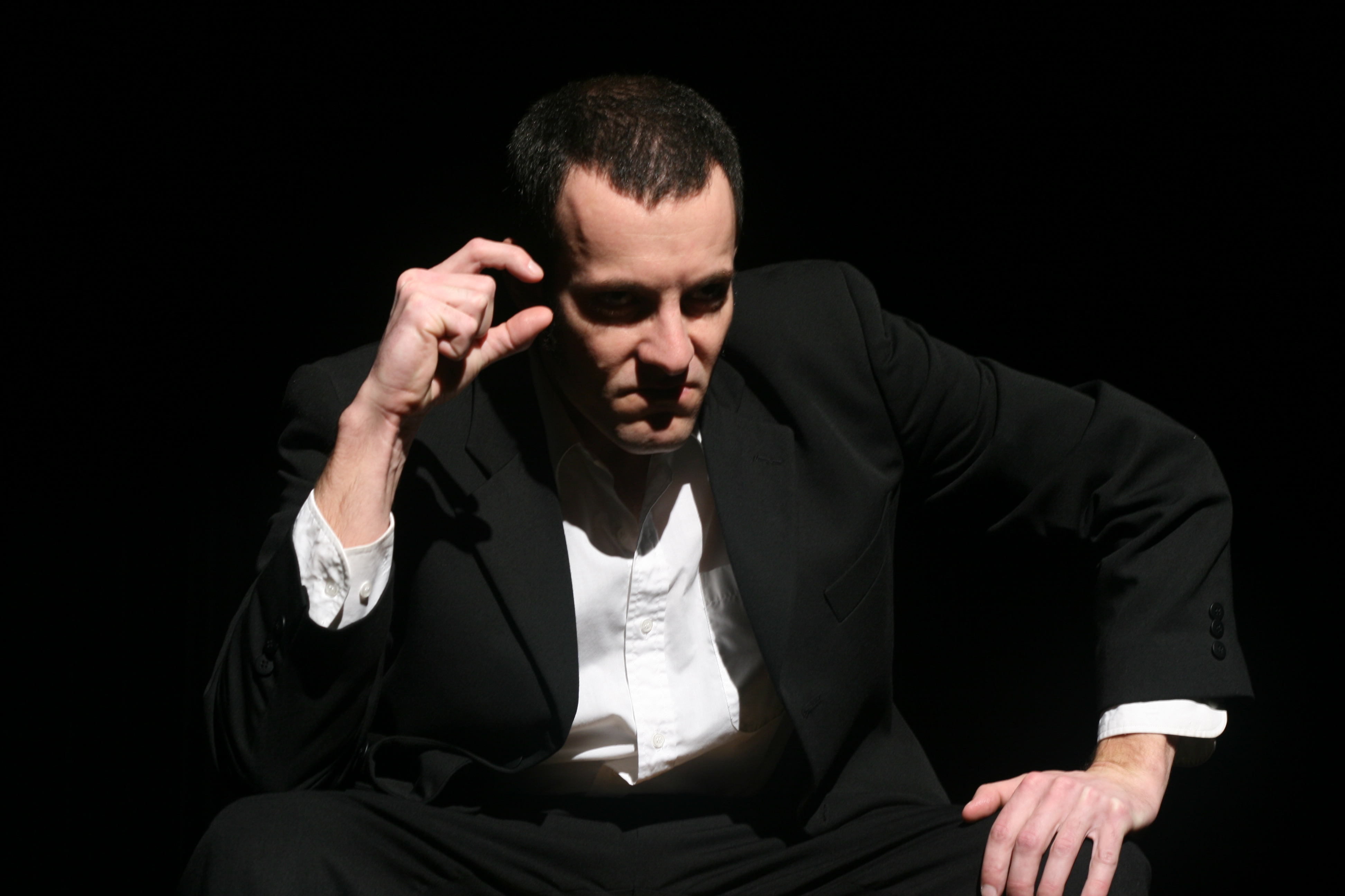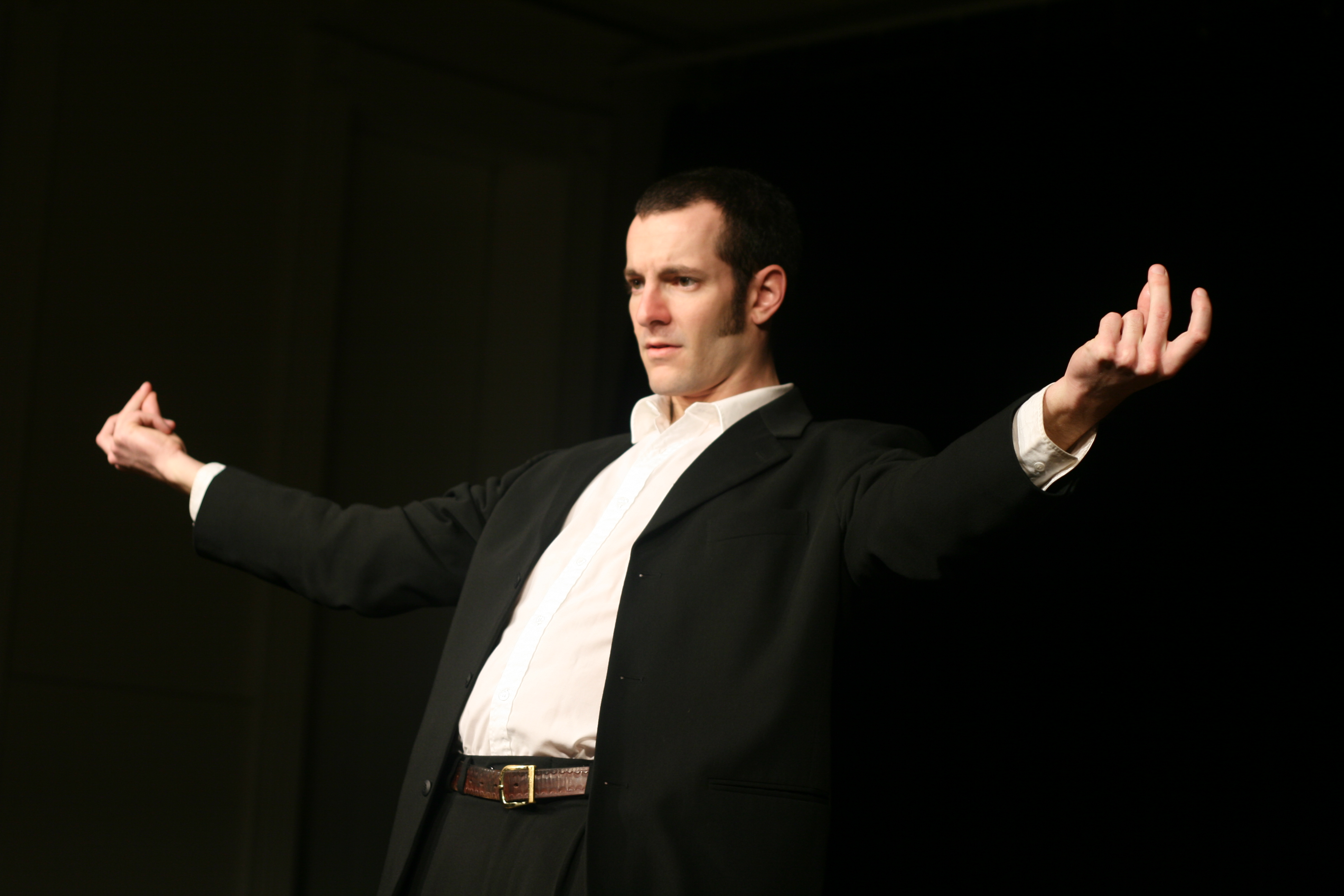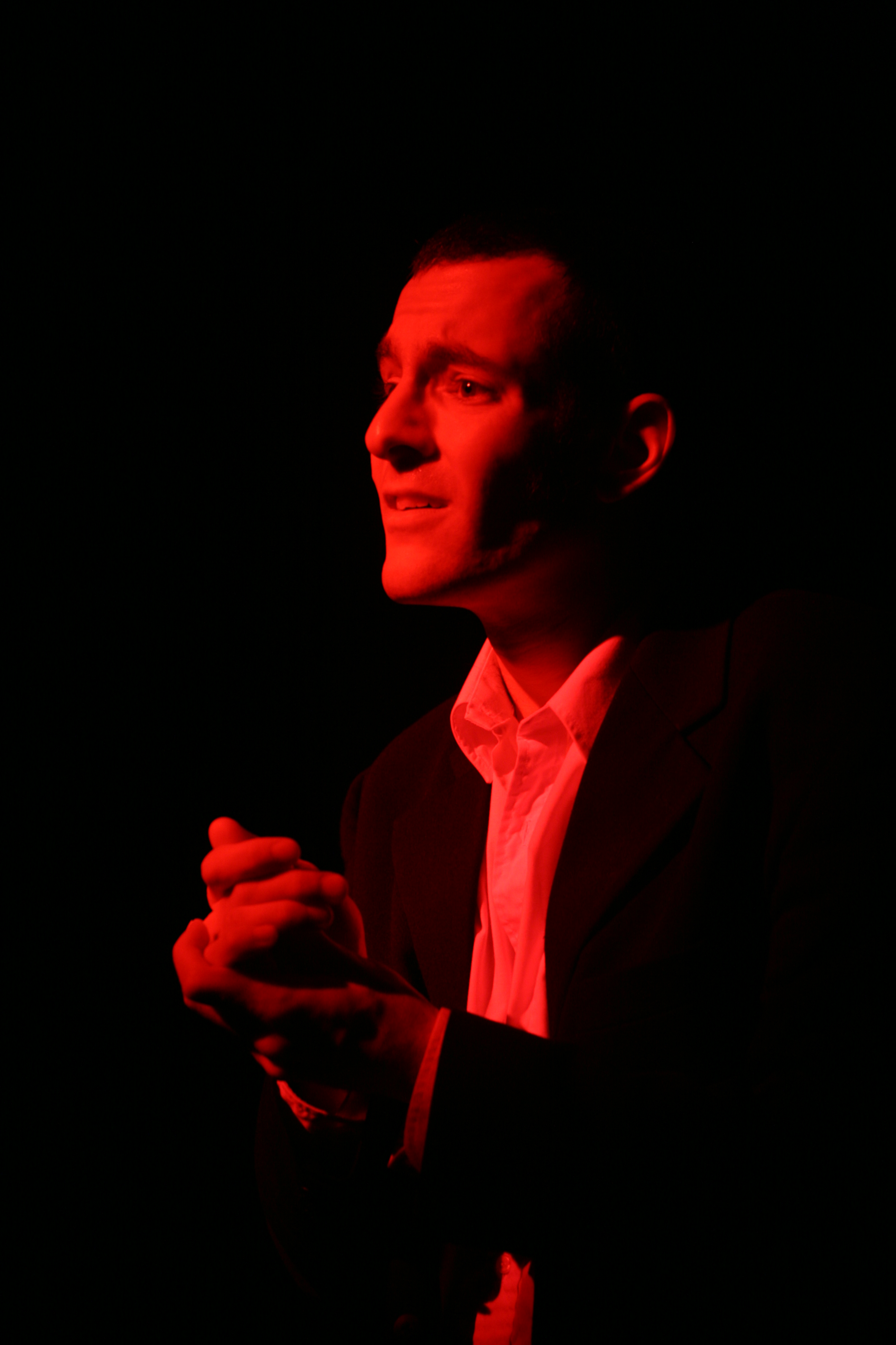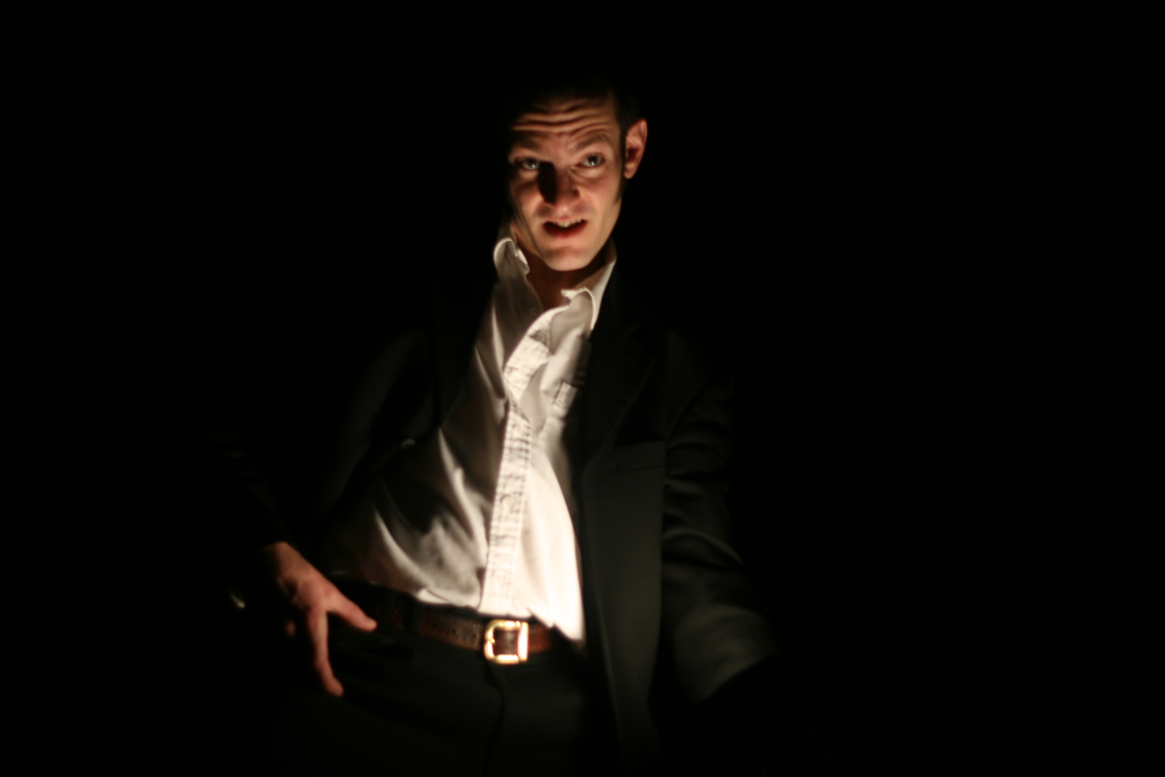 [VICTOR picks up the clamp lamp, snaps his fingers, stage lights out, clamp lamp on]