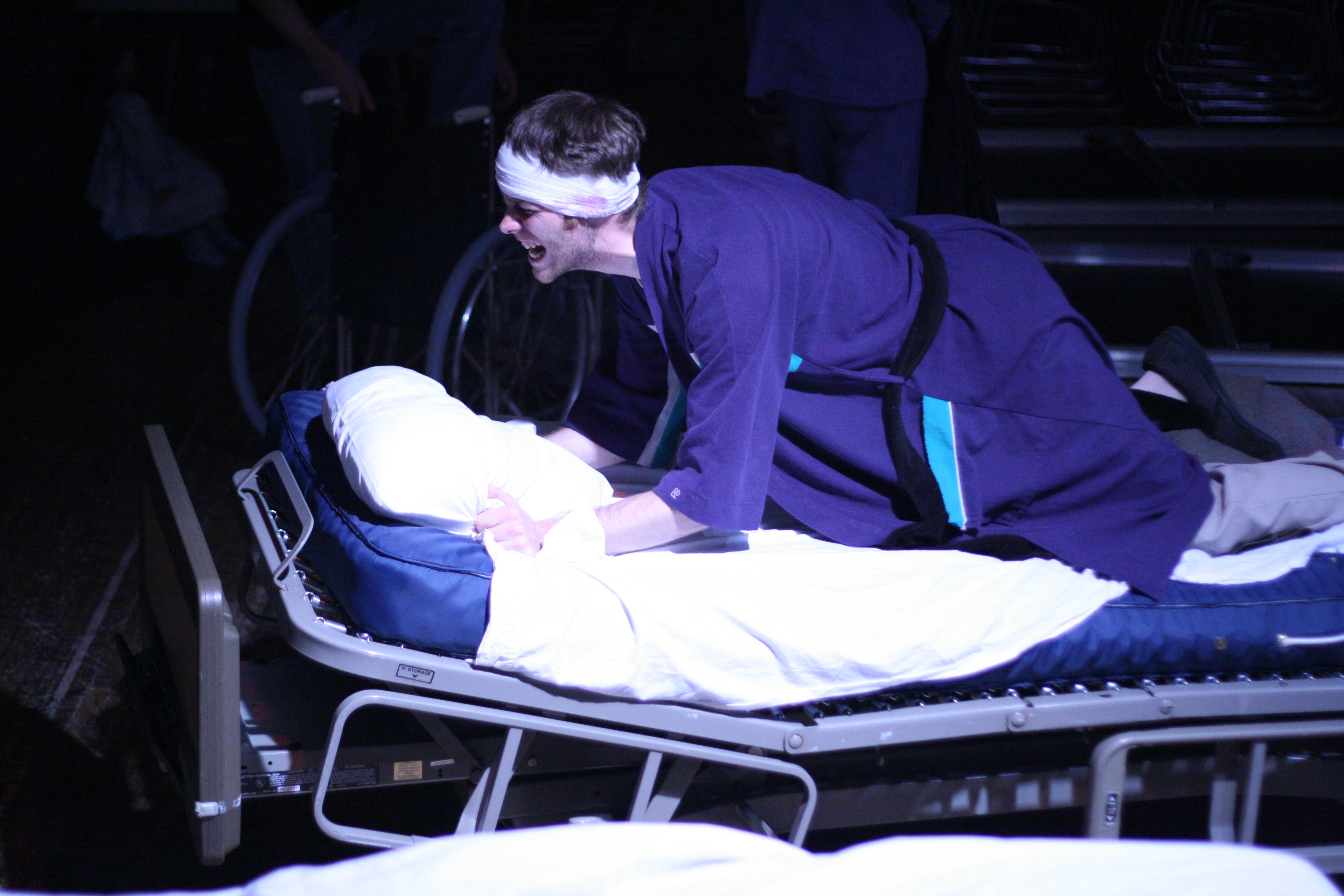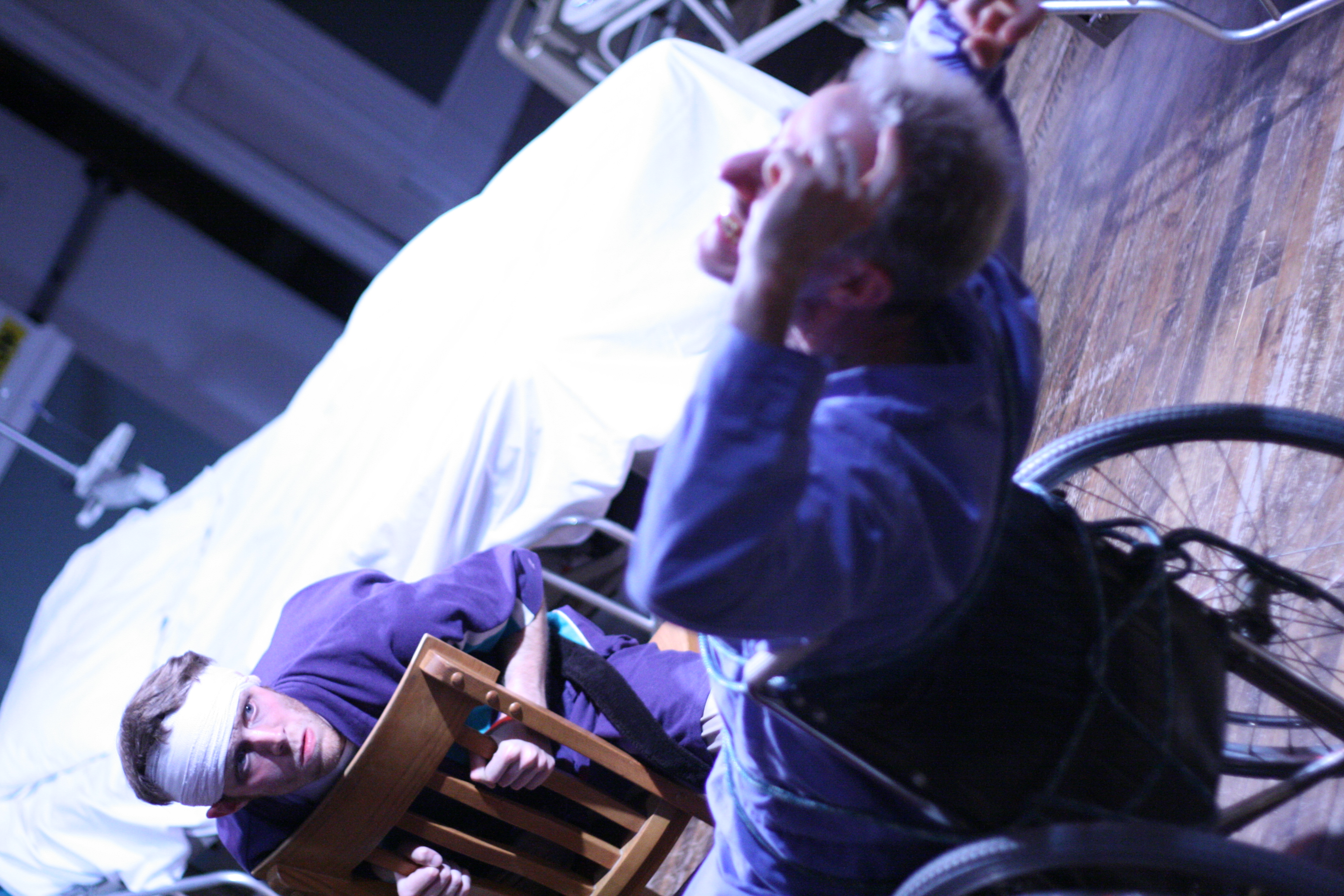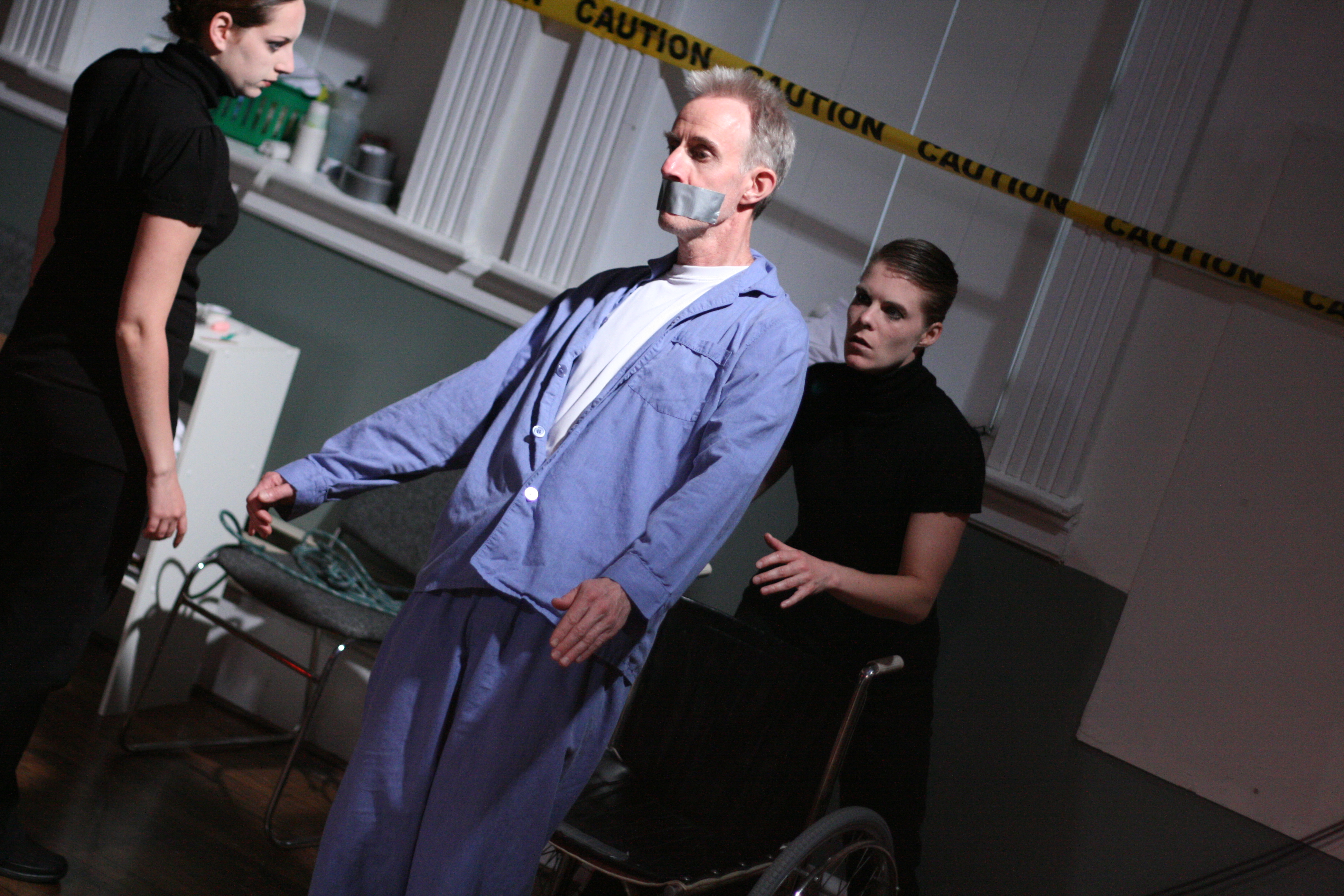 (The Nurses approach the forensics expert in order to apprehend and stop him from continuing. They immediately retrieve him to the floor space, strip him of his labcoat, tie him to the wheelchair and tape his mouth. From time to time he is able to work free of the tape to speak.)
