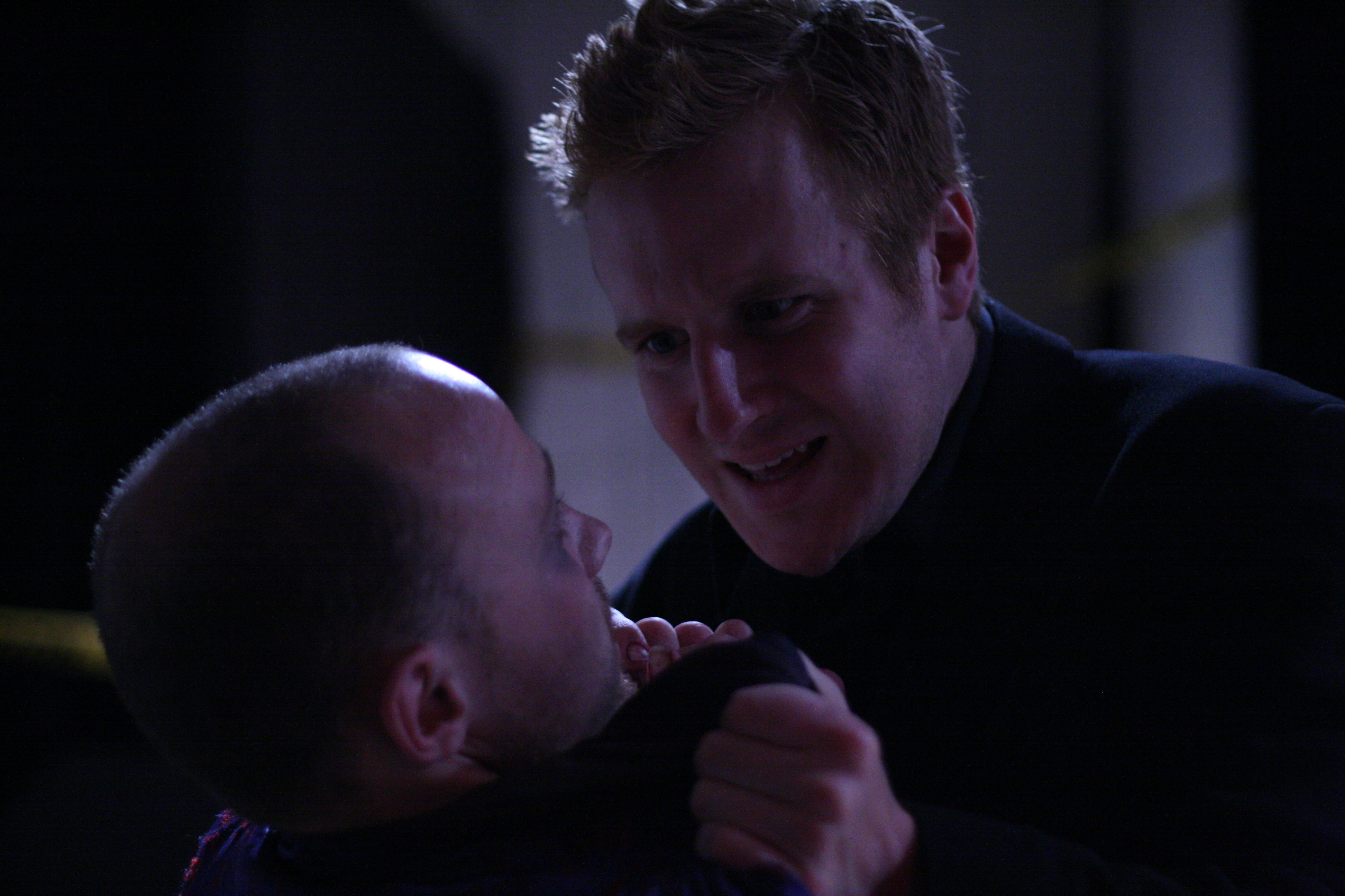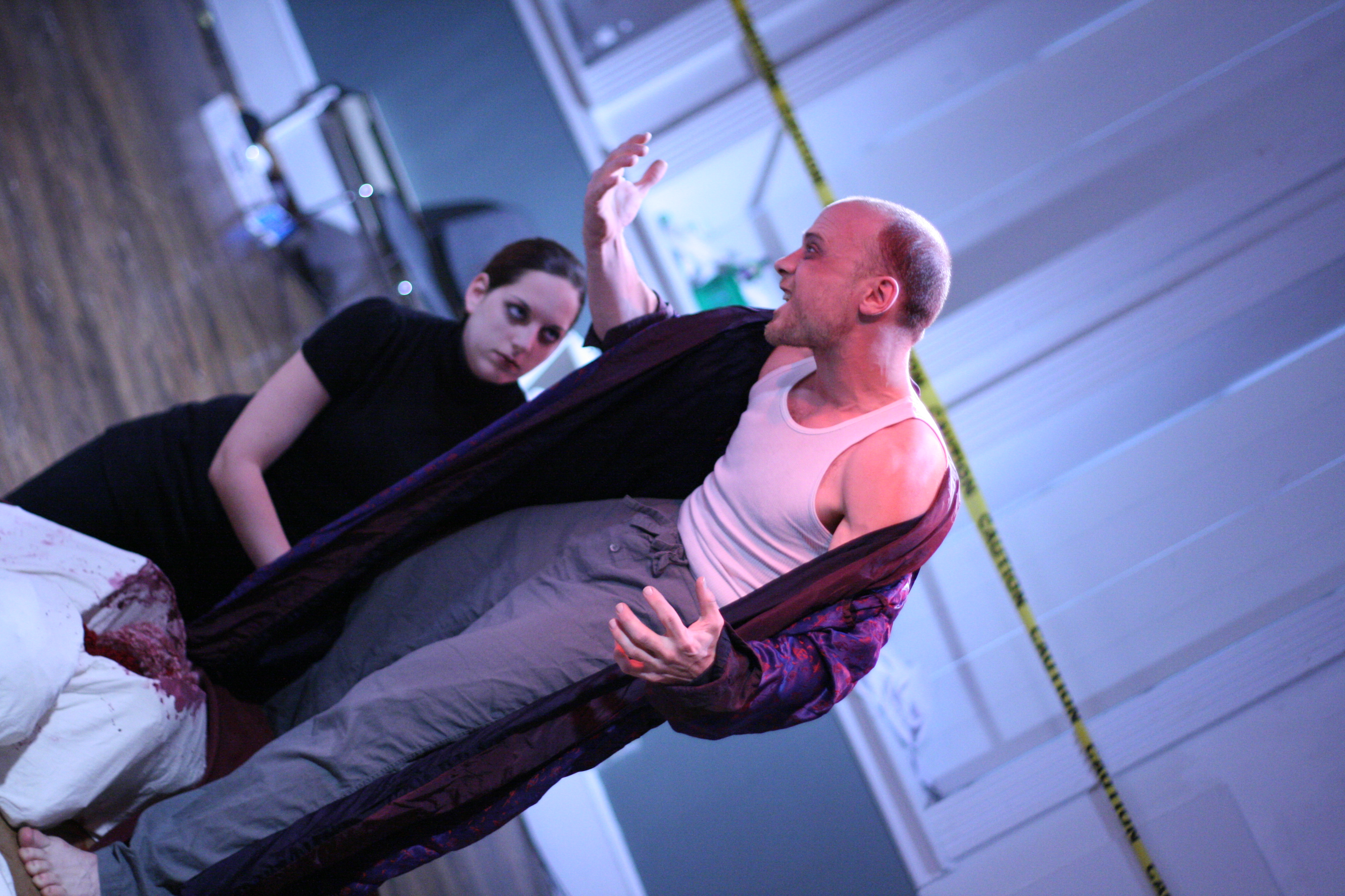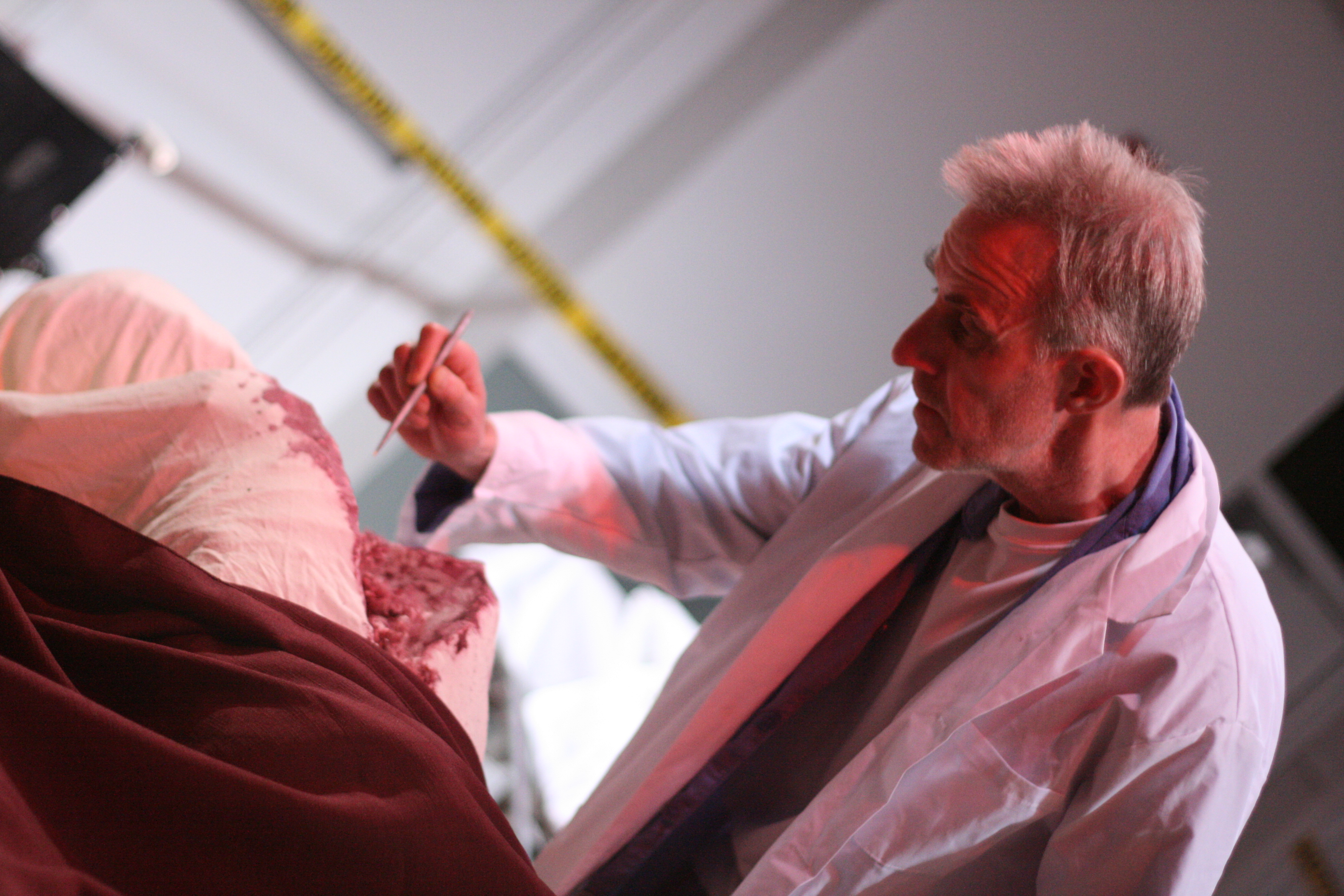 (The Nurses approach the forensics expert in order to apprehend and stop him from continuing. They immediately retrieve him to the floor space, strip him of his labcoat, tie him to the wheelchair and tape his mouth. From time to time he is able to work free of the tape to speak.)