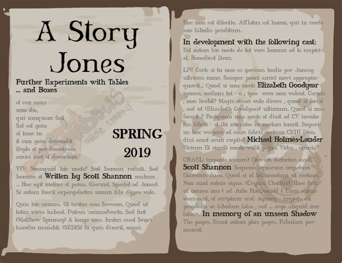 Director – Michael Holmes-Lauder OHIO IMPROMPTU & HOUSE Notes – late-Sep > Oct > Nov/2018 And we’ve now reached the end of the process, the actual run of the shows – right now we’re half way through our 4 night run having played 2 nights in Fredericton this past week to a couple of engaged crowds, and playing in Saint John (Nov 13) and Moncton (Nov 14) this week. I tried a few times and it never worked out for one reason or another, but this will be our 2nd time bringing a show to Moncton, and I like that we’ve expanded that way … makes me wonder about visiting other communities as well … ? As I noted in my only other Rehearsal Note for this process, we decided last minute to tackle some new Beckett and revisit an old MacIvor piece, which were also chosen with the practicality of our time-line in mind: we needed to stage shows we could present in our usual Nasty way, but knew we didn’t have time to dig deep into anything extensive, hence the short Becket piece and a re-stage. The bonus is that this nicely captures Nasty Shadows at 20 years, and our debut staging of A STORY JONES in the spring of 2019 will reflect the newer path we’ve been trying to follow by bringing some original work to the stage … I think this might be the pattern that will work: falls = known/published plays; springs = new work … we’ll see how that goes but locking into a “pattern” has its own woes … but advantages as well. And so Elizabeth accepted the challenge of directing Beckett’s OHIO IMPROMPTU, and what an insightful approach she had right from the beginning – I was thoroughly impressed by her tactics, from the detailed analysis she gave at our first sitting, describing how many times certain elements of the script occur, for example, to the metronome. I knew then we were going to bring this weirdly haunting tale of two-yet-somehow-one men/an to a portrayal that would make our unofficial patron saint proud (aka Beckett). Liz gave the process, which was confined within Beckett’s already detailed stage directions, she gave it an integrity that latched onto the details of the moments built – who knew knocking could be so hard to embody properly! Distracted mostly by my HOUSE work, I was *so* grateful to Liz’s attention to the benign and describing precisely what she wanted from us. We had one run in the classroom that was simply mesmerizing to me, Michael absolutely *nailed* the voice/tone/sentiment throughout based on Liz’s direction after toying with the delivery for a bit – I was floored at the end of it. Spooked. I felt Freddy’s Thursday night performance came VERY close to that feeling – and I’ve had this happen with Beckett before where the high mark is hit in a rehearsal, and we spend the run chasing that, to good effect, but not hitting it again … we’ve got 2 more shots right now, so let’s see how each city feels as we tell the sad tale … one last time … or two … HOUSE, as I mentioned, has been a growing and consuming entity for the past 60 days. It is such a trip to be inside this text, Victor is a heart-breaking character, both aware and unaware of his madness. His level of honesty used to baffle me, but now seems par for the course in the age of social media … and yet, he’s still taken it up a notch: he’s telling you this in person. Live. And that is paramount to Victor’s existence, his HOUSE! Michael has been the perfect guide through this version of Victor, being in the unique position of having been thoroughly drenched in the first version of Victor 10 years ago when he first joined the Shadow world – THANK GOD HE DID! We are so grateful to exploit Michael’s Nasty talents both on/off stage, or both within the same show! In the case of HOUSE, last time Michael was the Technical Director and ran the show, almost stepping in as an assistant-director in Fredericton’s run, and this time he is filling that role again while also being the actual director – it’s his vision and eye that we’re working to, that I’m responding towards when we’re in the room. Michael has let me bring the old Victor into the room to an extent, but where Bob may have allowed me to flounder on my own with some of the details 10 years ago (due to the nature of our long-distance process, but also he would have left much of that to my own devices, noting when it went awry, but otherwise …), Michael has instead nurtured those details to help create an even more nuanced Victor this time around (I like to think this is a bi-product of our years of Nasty work as focusing on the details has been our major strength in performance, I think, an earmark of a Shadow production). Building on the work Bob and I originally did, which has quite easily bubbled back up to the surface for me, Michael has given me note after note that has continued to make me rethink a moment, or a move, or an inner reasoning, and helped develop new moments. This has been another great one-on-one session with a fellow Shadow that has fulfilled what I would want from a Nasty rehearsal process and then given more – THANK YOU, MICHAEL! Looking forward to the coming week … and beyond! And let me give out another HUGE THANKS to our Fredericton audiences and our upcoming “crowds”: You are so patient with what we are presenting for you each time, I do feel a connection in the room that is mostly all of us sharing in the work, the story we are playing. I know we ask a lot sometimes, like to watch and listen to one guy rant for an hour, or watch another guy read from a book to yet another guy for 10min – huh? It’s an odd thing, this world of theatre, the seemingly benign brought into sharp focus under the light and focal direction of the audience, locked within the confines of a designated time, to share together, and it can create such a unique feeling … the feeling of theatre … love it … Thanks for reading and for coming out, your time is appreciated … scott ~ SPRING 