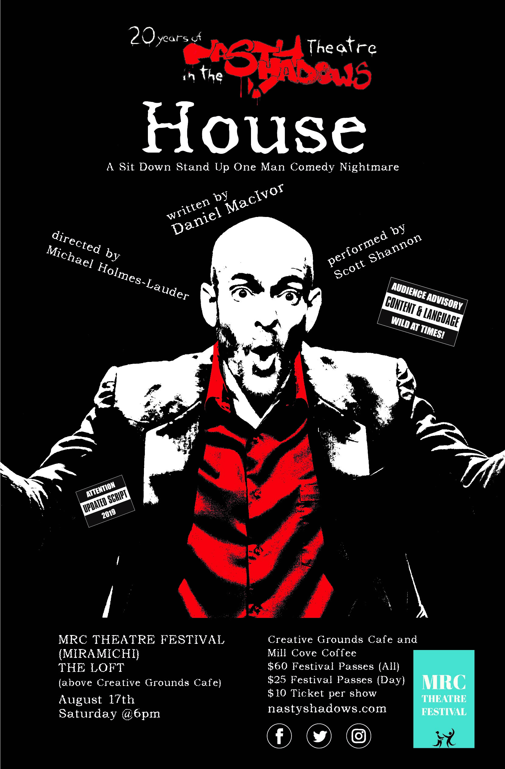 Director – Michael Holmes-Lauder Nasty Shadows originally staged House in 2008, and then revived the show 10 years later in the fall of 2018. Summer 2019 finds the Shadows playing HOUSE in the Miramichi (MRC Theatre Festival) and in Saint John (Fundy Fringe Festival). This current production builds off the recent revival but also incorporates a newly updated script provided by Daniel MacIvor. HOUSE Notes – July 16 2019 Always interesting to revisit a script, with the lessons learned from the previous venture(s) and the thrill of performing what must be a script worth coming back to … right? Certainly! House, like many/most of MacIvor’s scripts uses a language that seems simple upon first blush, but his control and choice of words, ideas expressed by those words, and the way it all mashes together in the performance is something I rarely find in other scripts. I am so grateful to have been steered in the direction of MacIvor’s work — which was only 12 years ago or so. His plays fill me with a joy and wonder for life and its performance. I am also grateful for the chance to play ‘Victor’ again, perhaps for the last time … last fall the character’s hardship really resonated more so than it did 10 years ago when we first performed the show. He’s a sad guy … trying to live a good life … but it’s life that offers him the chance to perform and tell his tale. Beautiful Really looking forward to playing in Miramichi for the first time, and bring the show back to Saint John but inside the Fundy Fringe festivities! ‘Victor’ LOVES a room full of people! ~ NASTY FALL 2019 ~ Stay tuned … more details TBA … ~ LINKS TO NASTY STUFF ~